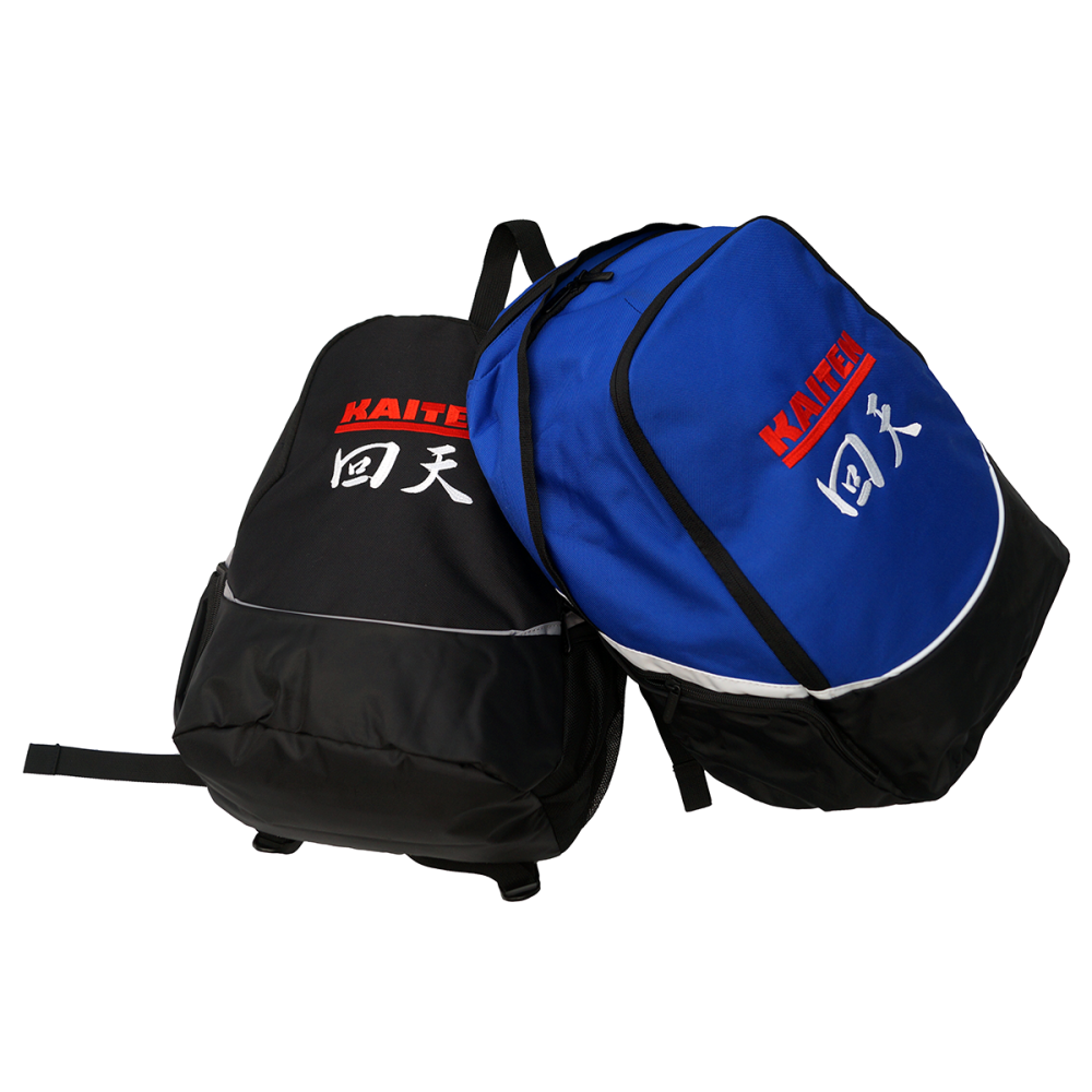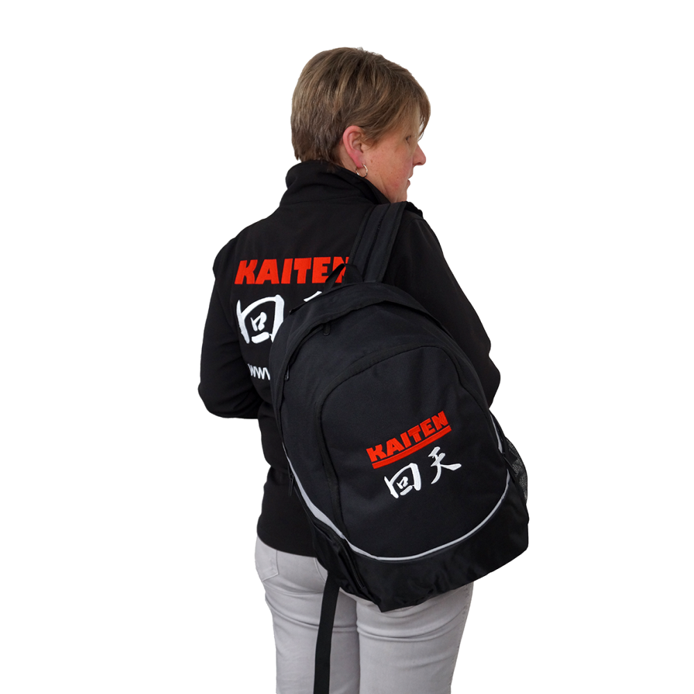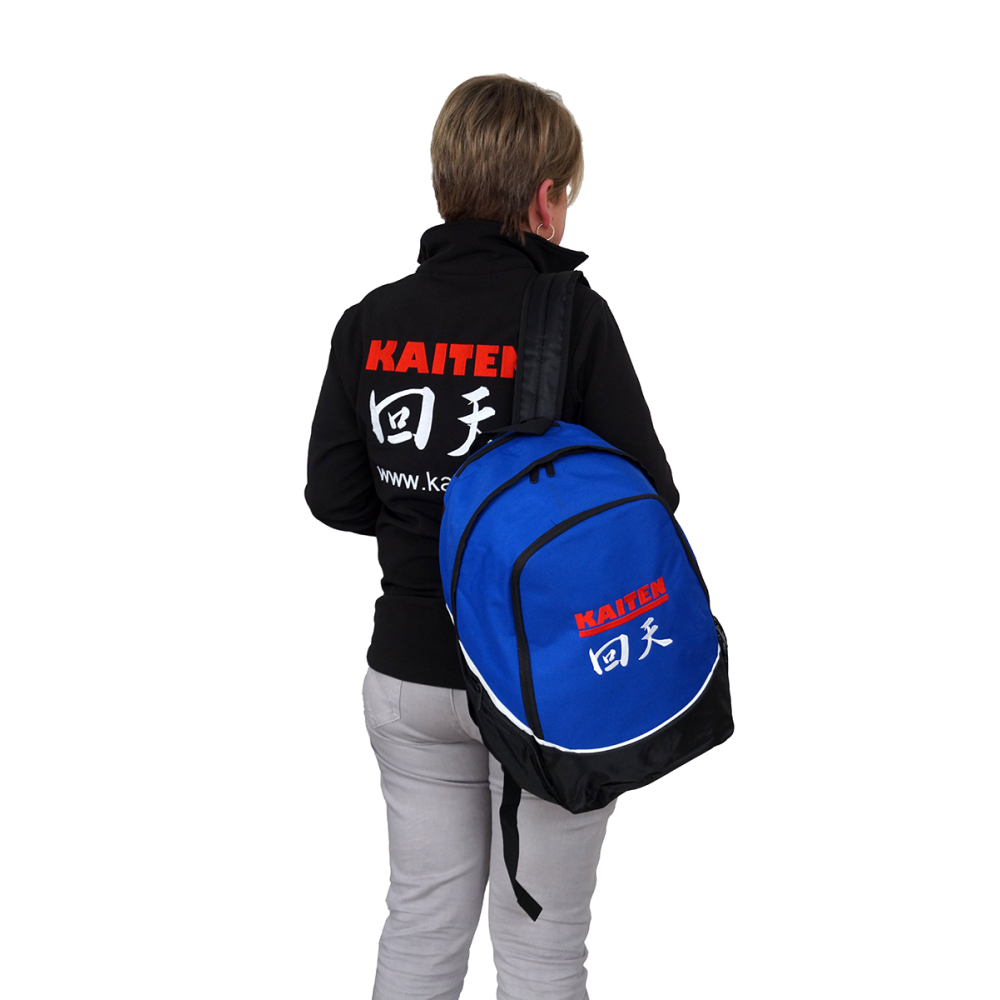 Kaiten rugzak in het rood, zwart en blauw met ritssluiting. Met aparte vak voor natte kleding, een media zak met binnenvoering, een hoofdtelefoon poort en een zijvakje voor de sportfles.